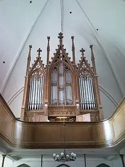 Die Orgel auf der Westempore wurde im Jahr 1861 vom Wismarer Orgelbauer Friedrich Wilhelm Winzer gebaut und ist bis auf einen später ergänzten elektrischen Motor noch im Originalzustand erhalten. Nach Restaurierung wurde am 31. Oktober 2022 die Wiedereinweihung mit einem Gottesdienst gefeiert.[6] Das Instrument mit mechanischen Schleifladen verfügt über 21 Register, die auf zwei Manuale und Pedal verteilt sind. Der neugotisch gestaltete Prospekt wird durch drei spitzbogige Pfeifenfelder geprägt, die durch Pilaster gegliedert werden. Das mittlere Flachfeld ist leicht überhöht und in sieben kleinere Felder unterteilt. Das Untergehäuse wird durch ein Spitzbogenfries und der obere Teil durch Maßwerk mit Dreipass und Vierpass verziert und von Fialen mit Kreuzblumen bekrönt. Der vorderspielige Spieltisch ist mittig angebracht. Die Disposition lautet wie folgt:[7]