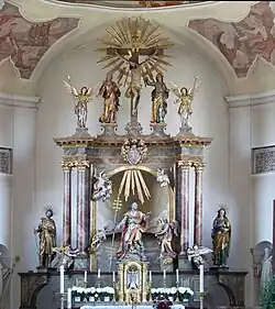 Der klassizistische Hochaltar wurde laut Bezeichnung auf der Rückseite im Jahr 1808 geschaffen – wohl unter Einbeziehung älterer Teile. Sein Aufbau wird von vier Rundsäulen getragen und von zwei seitlichen Durchgängen flankiert. Der vergoldete, von Voluten eingerahmte Tabernakel dient als Sockel für die in einer Rundbogennische untergebrachte Hauptfigur, die den Apostel Petrus, auf einem Felsen kniend, darstellt. Zwei Engel reichen dem Apostel die päpstlichen Insignien, die Tiara (rechts) und den Stab mit dem Papstkreuz (links). Ein weiterer Engel übergibt von oben her den Schlüssel an Petrus. Die Schnitzfigur des Petrus trägt die Signatur des in Landshut ansässigen Bildhauers Christian Jorhan des Älteren und ist mit der Jahreszahl 1790 bezeichnet. Die farbliche Fassung in Silber, Gold und Rot führte der ebenfalls in Landshut tätige Joseph Gausrad aus. Die Kreuzigungsgruppe im Auszug, von zwei weiteren Engeln flankiert, ist eine Arbeit aus der Zeit um 1750. Alle fünf Figuren stehen auf kleinen Sockeln über dem verkröpften Gebälk des Hochaltares.[2]
