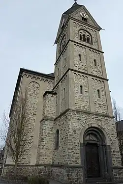 Die dem heiligen Petrus gewidmete Kirche aus Bruchsteinen ist eine dreischiffige Hallenkirche mit vier Achsen. Da durch ein Unwetter im Jahr 1865 der Turm schwer beschädigt wurde, errichtete man 1868/72 einen neuen Turm nach den Plänen des Koblenzer Architekten Hermann Nebel, Sohn von Ferdinand Nebel. 1932 wurden an den Chor zwei Sakristeien angebaut.
