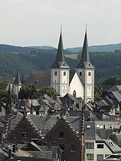 Das außen verputzte dreischiffige Gebäude hat die Grundform einer Emporenbasilika mit Querhaus. Allerdings ist der gesamte Bau von einem großen Satteldach gedeckt (seit dem 16. Jahrhundert). Eine Besonderheit sind die unterschiedlich breiten Seitenschiffe, die auch dem äußeren Bau eine Asymmetrie verleihen. Der Baustil ist von der späten Romanik und der frühen Gotik geprägt. Bemerkenswert sind die Türme, von denen es insgesamt vier gibt. Die zwei Westtürme tragen die Glocken und bilden zusammen mit dem Giebel des Langhauses eine beeindruckende Fassade, wohl einzigartig im Gebiet des Westerwalds. Außerdem besitzt das Bauwerk noch zwei kleinere seitliche Türme, einen Nord- und einen Südturm. Die Türme sind durch Lisenen und Blendarkaden verziert und tragen spitze, schiefergedeckte Helme.