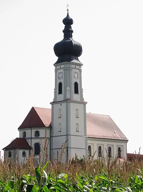 Das Langhaus der Saalkirche wurde 1734/35 nach einem Entwurf von Michael Pröbstl auf einer Anhöhe erbaut und ist damit das höchstgelegene Gebäude des Ortes. Der eingezogene, dreiseitig geschlossene Chor im Osten und der nördlich stehende Chorflankenturm auf quadratischem Grundriss sind im Kern spätgotisch. 1778 wurde nach Plänen von Johann Baptist Lethner der Turm um ein achteckiges, mit einer Welschen Haube bedecktes Geschoss für die Turmuhr und den Glockenstuhl aufgestockt. Im Turm hängt ein vierstimmiges Bronzegeläute in der Schlagtonfolge e1 - g1 - a1 - c2. Ferner wurden der Chor erhöht und an dessen Scheitel die Sakristei angebaut.