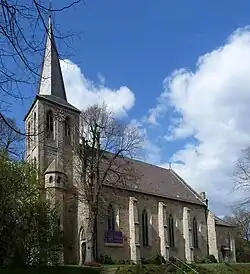 Die neugotische Hallenkirche wurde 1856–60 anstelle einer baufälligen Fachwerkkirche nach einem Entwurf von Emil von Manger erbaut. Sie besteht aus einem Langhaus mit vier Jochen, das mit einem Satteldach bedeckt ist, und dessen Wände von Strebepfeilern gestützt werden, zwischen denen sich Maßwerkfenster befinden, einen eingezogenen Chor mit einem Joch und Fünfachtelschluss im Norden und einem Kirchturm im Süden, dessen Wände mit Lisenen gegliedert und mit einem Bogenfries unter des Dachtraufe verziert ist. Der Kirchturm ist mit einem schiefergedeckten, achtseitigen Knickhelm bedeckt. Sein oberstes Geschoss beherbergt die Turmuhr und den Glockenstuhl. An seiner Ostwand schmiegt sich ein achteckiger Treppenturm.