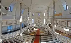 Der Raum weist zweigeschossige, umlaufende Emporen auf. Die zwei zur Kirche gehörenden Kesselpauken wurden 2001 restauriert und schmücken den Raum. Im Osten steht der zweigeschossige Kanzelaltar. Die Mitteltür zum Raum ist mit verglasten Fenstern flankiert und daneben tragen Säulen den Kanzelkorb. An der Seite befinden sich Figuren von Moses und Christus. Palmenbäume schmücken den Kanzelzugang.[2]
