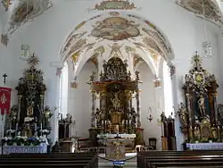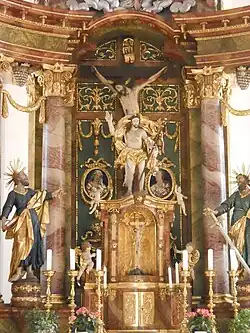 - Den viersäuligen Rokoko-Hochaltar schuf 1790 der Bildhauer Thaddäus Kronenbitter aus Neuburg an der Donau;[6] die jetzige Fassung stammt von 1829 von Josef Kopf.[7] Im Schrein befindet sich ein Kruzifix mit zwei begleitenden Reliefmedaillons, die in Brustbildern Maria und den Lieblingsjünger Johannes zeigen. Die Assistenzfiguren sind die Kirchenpatrone. Auf dem klassizistischen, 1913 umgebauten Tabernakel sind eine Pelikanfigur als Symbol für Jesus Christus und eine Salvatorstatue (vor 1790) zu finden.