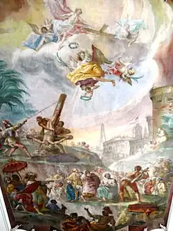 - Die Kanzel (um 1790) ist ockerrot marmoriert und silber-gold-dekoriert. Am unteren Rand des polygonen Korpus sitzen Putten mit Symbolen der christlichen Tugenden, an der Rückwand befindet sich eine Christusfigur. Am Schalldeckel zeigen sich die Symbole der vier Evangelisten, den Abschluss bildet ein posaunender Engel.[9]