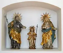 - Der Figurenschmuck zeigt u. a. eine „gute“[9] Madonna (um 1480; spätere Neufassung), Büsten des hl. Joachim und der hl. Anna (um 1730) und eine spätbarocke Kreuzigungsgruppe.