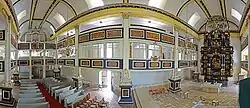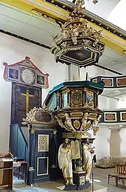 Am freistehenden Mittelpfeiler der unterbrochenen Südempore befindet sich die Kanzel, ihr gegenüber die verglaste Patronatsloge.