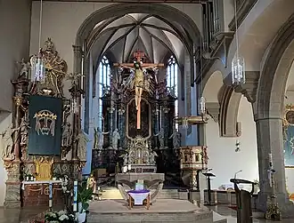 - Über dem Zelebrationsaltar hängt ein spätgotisches Kruzifix, das der Werkstatt von Tilman Riemenschneider zugeschrieben wird.