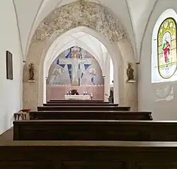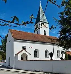 Die spätgotische Saalkirche besteht aus dem Langhaus, dem eingezogenen Chor im Osten und dem 1848 hinzugefügten Chorflankenturm an der Nordwand des Chors. Sie wurde 1938/39 mit dem Neubau von Michael Steinbrecher verbunden.