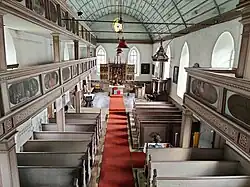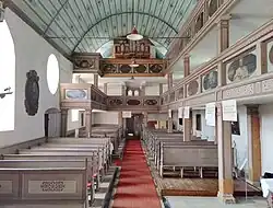 Die Saalkirche hat im Osten einen geraden Abschluss und im Westen den Kirchturm. In der Umbauzeit von 1712 bis 1716 wurden im langgezogenen, rechteckigen Saal zweigeschossige Emporen an der Nord-, West- und teilweise an der Südseite errichtet. Auf ihren Brüstungen sind Bilder von den Propheten, den Evangelisten und anderen biblischen Gestalten und Szenen sowie Sprüche gemalt. Das hölzerne Tonnengewölbe erhielt um 1900 eine Schablonenmalerei. Das dreiteilige Altarretabel von 1516 hat im Schrein ein Relief mit der Darstellung der Beweinung Christi, flankiert von je zwei übereinander angeordneten Heiligenfiguren, links Petrus, darunter Katharina, rechts Paulus, darunter Barbara. Auf den Innenseiten der Flügel sind die elf Apostel und Bonifatius, auf den Außenseiten Szenen aus der Passionsgeschichte gemalt. In der Predella sind vier rekonstruierte Büsten weiblicher Heiliger. Das Relief mit der Beweinung Christi wird dem Meister des Deubacher Altars zugeschrieben, die Heiligenfiguren und die Reliquienbüsten dem Meister vom Reliefs des von der Familie Purgold gestifteten Altars. Das Mittelrelief des Purgold-Retabels[2] befindet sich im Thüringer Museum (Eisenach), die Flügel in den Kunstsammlungen Weimar. Die hölzerne Kanzel befindet sich an der Südseite, am achteckigen Schalldeckel mit der Figur des Auferstandenen ist die Jahreszahl 1668. Nachträglich wurde unter die Kanzel ein Pfeiler mit einer Herme gestellt, die eine Halbfigur eines bärtigen Mannes mit Buch zeigt. Die Kartusche am Pfeilerschaft weist auf Entstehung um die Mitte des 18. Jahrhunderts hin. Ein hölzernes, der Kanzel ähnlich ornamentiertes Taufbecken stammt aus der gleichen Entstehungszeit. Das Fragment eines Kreuzsteins ist bündig an der Nordseite des Kirchenschiffs eingemauert. In der nördlichen Außenwand des Kirchenschiffes befinden sich einige vermauerte Fenster sowie eine Türöffnung, die nur zum Teil verputzt wurden. Von der einstigen romanischen Bausubstanz ist im Oberteil des Kreuzsteines ein Krückenkreuz eingehauen.[3] Drei Glocken aus Stahl wurden 1920 und 1948 gegossen.[4]