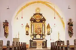 Der Innenraum des Chors ist mit einem Kreuzrippengewölbe überspannt. In ihm befindet sich ein barocker Altar, dessen Altarretabel die Heilige Familie zeigt, und der von Säulen flankiert wird. Bei der Renovierung des Innenraums 1961/62 wurde die neugotische Kirchenausstattung entfernt.
