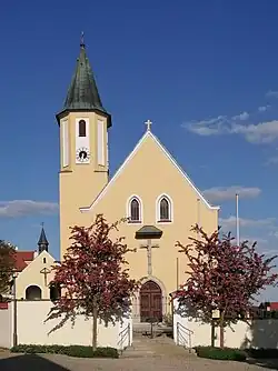 Die im Kern gotische Saalkirche wurde 1336 bis 1361 erbaut und 1439 erweitert. Aus dem Spätmittelalter stammen die unteren Geschosse des Kirchturms und der querrechteckige Chor. Der Kirchturm an der nördlichen Wand des Langhauses wurde 1757 mit einem achteckigen Geschoss aufgestockt, das die Turmuhr und den Glockenstuhl enthält und mit einem achtseitigen Knickhelm bedeckt ist. Das Langhaus wurde 1886 nach Westen erweitert.