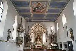 Der Innenraum des Langhauses ist mit einer Flachdecke überspannt, der des Chors mit einem Netzgewölbe auf diagonal angeordneten Konsolen. Die Kirchenausstattung von 1894 ist neugotisch. Auf einem um 1630 entstandenen Gemälde ist eine Schutzmantelmadonna dargestellt.