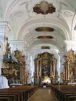 Die Deckengemälde wurden um 1702/03 von dem Laienbruder Magnus Remy ausgeführt und sind teilweise signiert. Sie sind in Öl auf Leinwand gemalt und auf Holzrahmen gezogen. Die Bilder zählen zu den ältesten Deckengemäldezyklen in Schwaben. Es werden die Gründung des Klosters dargestellt, der Gründer des Benediktinerordens, der heilige Benedikt von Nursia, die Nebenpatrone, die Apostel Petrus und Paulus, die Katakombenheilige Eugenius, Faustus und Candidus, deren Reliquien in gläsernen Schreinen in den Altären der Kirche aufbewahrt werden, sowie von den Benediktinern besonders verehrte Heilige wie Bernhard von Clairvaux, Ildefons von Toledo, Rupert von Salzburg, Fulbert von Chartres, Beda Venerabilis, Meinrad von Einsiedeln, Johannes von Damaskus, Hermann der Lahme von der Reichenau und Petrus Damiani. Die Bilder an den Emporenbrüstungen im Langhaus stellen Szenen aus dem Leben des heiligen Benedikt von Nursia dar.