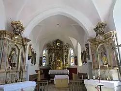 Die spätgotische Saalkirche vom Ende des 15. Jahrhunderts wurde 1795 barock überarbeitet. Sie besteht aus dem Langhaus zu drei Jochen, dem eingezogenen, dreiseitig geschlossenen Chor im Osten, dem mit einem spitzen Helm bedeckten Chorflankenturm aus Quadermauerwerk an der Nordwand und der Sakristei, in deren Obergeschoss ein Oratorium eingerichtet wurde, an der Südwand des Chors.