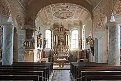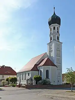 Die im Kern in der zweiten Hälfte des 16. Jahrhunderts gebaute Pseudobasilika wurde 1795/96 klassizistisch und 1894 neobarock umgestaltet. Sie besteht aus einem Langhaus aus einem Mittelschiff und zwei Seitenschiffen, einem eingezogenen, dreiseitig geschlossenen Chor im Osten und einem Chorflankenturm auf quadratischem Grundriss an dessen Nordwand. Der Chorflankenturm wurde mit zwei achteckigen Geschossen mit Pilastern an den Ecken aufgestockt, die den Glockenstuhl und die Turmuhr beherbergen, und mit einer Zwiebelhaube bedeckt. Der Innenraum des Mittelschiffs ist mit einem flachen Tonnengewölbe überspannt, die vier Joche der Seitenschiffe mit Kreuzgratgewölben, der des Chors mit einer Flachdecke. Der Hochaltar wurde 1796 gebaut. Das Bild einer Anna selbdritt wird Christoph Rodt zugeschrieben. Die Orgel mit 21 Registern, zwei Manualen und einem Pedal wurde 1996 von Siegfried Schmid gebaut.