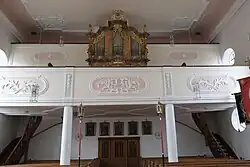Die Saalkirche besteht aus einem Langhaus, das 1713 erneuert wurde, einem eingezogenen, halbrund geschlossenen Chor im Osten, der 1685 neu gebaut wurde, und einem Chorflankenturm an der Nordwand, dessen untere Geschosse von einem Chorturm aus dem 14. Jahrhundert stammen und der 1685 aufgestockt wurde. Das Erdgeschoss des Chorturms dient als Sakristei. Der Innenraum des Langhauses ist mit einer Flachdecke überspannt, der des Chors mit einem Stichkappengewölbe. Der Stuck im Chor von 1713 ist als Akanthus gestaltet. Der Hochaltar wurde 1715 gebaut. Auf dem Altarretabel sind die Apostel Simon Petrus und Paulus von Tarsus dargestellt.