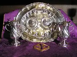 Darüber hinaus verfügt die Pfarrkirche über ein kupferversilbertes Kreuzreliquiar (um 1800), einen silbervergoldeten Kelch mit Deckel in reichem Rocaillewerk aus dem Jahr 1763 (Höhe: 24,5 cm), einen kupfervergoldeten Kelch mit Rosenblattfuß (Höhe: 22 cm), eine neoromanische Monstranz sowie silberne Messkännchen mit Innenvergoldung auf silberner Platte. Das Messkännchenservice, eine Augsburger Silberarbeit, zeigt das gekrönte Eheallianzwappen des Johann Wilhelm Ludwig von Hagen und dessen Gemahlin Anna Maria von Eltz (beide in der Lebacher Pfarrkirche Heilige Dreifaltigkeit und St. Marien bestattet) mit der Jahreszahl 1731.[44] Die linke Rundvertiefung auf der Platte zur Positionierung der Kännchens zeigt das Christusmonogramm IHS mit dem Heiligsten Herzen Jesu, die rechte stellt das Marienmonogramm mit dem Unbefleckten Herzen Mariä dar. Die Deckel der Kännchen sind mit den Buchstaben-Knäufen „A“ (für Aqua, dt. Wasser) und „V“ (für Vinum, dt. Wein) geschmückt und verfügen jeweils über eine Daumenrast. Die balusterförmigen Kännchen weisen eine gedrehte Godronierung mit Außenwölbung auf, wie sie im 18. Jahrhundert in den Augsburger Werkstätten äußerst beliebt war. Das Hagensche Messkännchenservice wurde laut Aussage des Historikers Johannes Naumann der Nalbacher Pfarrei im Zweiten Weltkrieg gestohlen und war seither nicht mehr aufgefunden worden.[45] Laut Aussage der Pfarrei befindet sich das Original allerdings in ihrem Besitz.