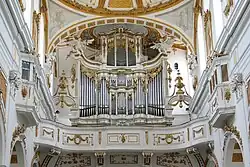 Die große Orgel wurde 1910 von der Orgelbaufirma G. F. Steinmeyer & Co. eingebaut und in den Jahren 1987–1988 generalüberholt. Der prächtige Orgelprospekt wird Johann Michael Fischer zugeschrieben und entstand um 1785. Er wird von zwei Posaunenengeln bekrönt. Das Instrument hat 27 Register auf zwei Manualwerken und Pedal. Die Spiel- und Registertrakturen sind pneumatisch.[3]