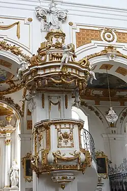 - Die aufwändig verzierte Kanzel aus der Zeit um 1785 wird einem Entwurf von Joseph Dossenberger zugeschrieben. Die Skulpturen, wie auch die Figur des Salvator Mundi auf dem Schalldeckel, schuf Johann Michael Fischer.