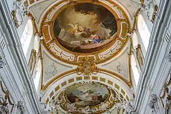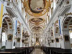 Die Kirche ist als dreischiffige Pfeilerbasilika angelegt. Das hohe, breite Mittelschiff öffnet sich in acht Rundbogenarkaden, die auf quadratischen Pfeilern mit Pilastervorlagen aufliegen, zu den wesentlich niedrigeren und schmaleren Seitenschiffen. Haupt- und Seitenschiffe werden von abwechselnd hoch- und querovalen Flachkuppeln überspannt, die mit großformatigen Fresken verziert sind.