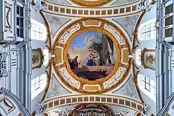 - Aus der gleichen Zeit wie die Kanzel stammt auch das auf der gegenüberliegenden Seite stehende Taufbecken und die lebensgroßen Stuckfiguren der Taufe Jesu, die Johann Michael Fischer zugeschrieben werden.