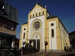 Der 65 m hohe Turm stammt mit seinen Grundmauern noch aus dem 13. Jahrhundert und trägt ein spitzes Helmdach. An der Fassade des Gebäudes, das zu den ältesten Bauwerken des Ortes gehört, ließ Architekt Anton Harrer ein großes Bildnis des heiligen Christophorus anbringen.[6]