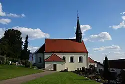 Die Saalkirche wurde 1650 erbaut, nachdem der Vorgänger abgebrannt war. Sie besteht aus einem Langhaus und einer eingezogenen, halbrund geschlossenen Apsis im Osten. Aus dem Satteldach des Langhauses erhebt sich im Westen ein achteckiger Dachreiter, der den Glockenstuhl beherbergt und der mit einem spitzen Helm bedeckt ist. Der Innenraum des Langhauses ist mit einer Kassettendecke überspannt, der der Apsis mit einem Stichkappengewölbe. Zur Kirchenausstattung gehört ein von je zwei Säulen gerahmter Hochaltar, der von den Statuen des Karl Borromäus und des Johannes Nepomuk flankiert wird.