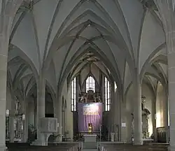 Die Kreuzrippengewölbe im Innern waren bis 1958 mit Rankornamenten verziert. In der Marienkapelle wurde diese Bemalung 1985 restauriert. Der barocke Hochaltar stammt noch aus der Vorgängerkirche. Er besitzt ein marmoriertes Säulenretabel. Im Zentrum befindet sich Jesus, ihm zur Seite gestellt die beiden Patrone Petrus und Paulus. Die Seitenaltäre sind Josef und Antonius von Padua gewidmet. Ebenfalls aus der alten Kirche wurden der spätbarocke Taufstein, eine Madonna aus dem späten 18. Jahrhundert und der Grabstein von Melchior von Talheim von 1580 übernommen.