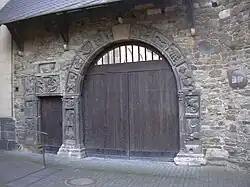 In seiner ursprünglichen Bauform bietet sich dem Betrachter wohl allein der Torbogen mit seinen Steinreliefs dar, da dieser Bauteil wegen der besonderen Ausgestaltung seiner einzelnen Steine von Anfang an nur zu einem Bogen zusammengefügt werden konnte. Dieser Torbogen trägt zehn Steinreliefs, an deren Deutung sich Theologen und Kirchenhistoriker seit dem 19. Jahrhundert versuchten. Herrschende Interpretationslinie ist nach wie vor die These des Bonner Ordinarius’ Albert Michael Koeniger aus dem Jahr 1947, der in den Symbolen die Darstellung der Todsünden gemäß dem Beichtspiegel des Bischofs Burchard von Worms erkannt haben will. Nach dieser Lesart, die noch acht statt der heute geltenden sieben Todsünden kannte, bedeuten die Reliefs von links nach rechts: