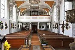 Die Saalkirche wurde 1710 errichtet. Sie besteht aus einem Langhaus, das 1921/22 nach Westen verlängert wurde, dessen Längswände mit Pilastern gegliedert sind, einem eingezogenen, halbrund geschlossenen Chor im Osten, einer Sakristei an der Südwand und einem Chorflankenturm an der Nordwand des Chors, dessen untere Geschosse vom spätgotischen Vorgängerbau erhalten geblieben sind. Das Portal befindet sich in einem Anbau vor der Fassade im Westen. Der Chorflankenturm wurde 1762 mit einem Geschoss mit konkav abgeschrägten Ecken aufgestockt, das die Turmuhr und den Glockenstuhl beherbergt, und mit einem Pyramidendach bedeckt. Der Innenraum des Langhauses ist mit einem Spiegelgewölbe überspannt. Auf der Empore im Westen steht eine Orgel. Die Fresken wurden 1937 eingefügt. Der um 1680 aufgestellte Hochaltar stammt aus der Wendelinkapelle in Bobingen.