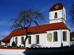 Die im Kern spätmittelalterliche Saalkirche wurde 1754 grundlegend erneuert und in den Jahren von 1957 bis 1959 in neobarockem Stil erweitert. Sie besteht aus einem Langhaus, einem eingezogenen, dreiseitig geschlossenen Chor im Osten und einem im frühen 16. Jahrhundert errichteten Chorflankenturms, der mit einem Krüppelwalmdach bedeckt ist, und der an der Nordwand des Chors steht. Sein oberstes Geschoss, in dem sich nach Osten ein Maßwerkfenster befindet, zeigt nach Süden das Zifferblatt der Turmuhr und darüber die Klangarkade des Glockenstuhls. An der südlichen Außenwand des Chors befindet sich eine Sonnenuhr, die Alfred Vollmar als Sgraffito und Mosaik ausführte.