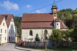 Der eingezogene, vierseitig geschlossene Chor stammt im Wesentlichen aus der 1. Hälfte des 15. Jahrhunderts. Das Langhaus von 1669 erhielt seine heutige Gestalt mit dem Mansarddach beim Umbau von 1754. Aus dem Dach des Chors erhebt sich ein quadratischer Dachreiter, der die Turmuhr und darüber den Glockenstuhl beherbergt, und mit einer Glockenhaube bedeckt ist. In der südöstlichen Ecke von Langhaus und Chor wurde ein Treppenturm aus verputztem Holzfachwerk errichtet.