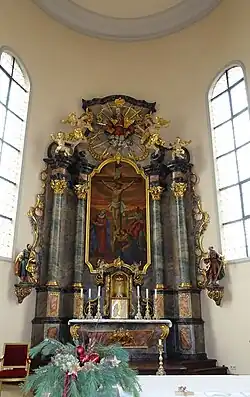 Meister der Kirchenpatrone am Hochaltar sowie der erhaltenen Skizze war vielleicht der auch in Kreuzerhöhung in Steinach tätige Franz Xaver Bieheler (1726–1787).[15] Nach der Skizze haben der Bildhauer Angelo Valentin und der Maler Peter Valentin aus Offenburg Ende der 1950er Jahre den Hochaltar neu geschaffen. Petrus und Paulus stehen außen. Zwei blaumarmorierte Säulen rahmen beidseits ein Gemälde der Kreuzigung. Im Auszug schweben zwischen Engeln als Reliefs Gottvater und die Taube des Heiligen Geistes.