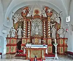 Der Taufstein stammt aus dem 17. Jahrhundert. Der barocke Hochaltar stammt ursprünglich aus dem Zisterzienserinnenkloster Anrode und wurde 1703 geschaffen. Bei der Restaurierung 1983 bis 1985 wurde die Figurenanordnung des Altars leicht verändert. In der Mitte ist die Krönung Mariens zu sehen. Links und Rechts davon stehen der heilige Laurentius von Rom, ursprünglich eine Darstellung des heiligen Benedikt, der heilige Bernhard von Clairvaux, sowie ganz außen die beiden Kirchenpatrone die Apostel Petrus und Paulus.[2]