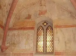 Die Fresken aus der Zeit um 1420 wurden bei der Innenrenovation 1974 unter der Tünche entdeckt und von Restaurator Alfred Panowsky, Gernsbach, freigelegt. Dargestellt ist die Leidensgeschichte Christi, darüber Engel, an der Decke die Symbole der 4 Evangelisten.