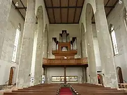 In der folgenden Zeit wurden noch weitere Arbeiten an der Innenausstattung durchgeführt. Nach dem Einbau der 1970 von Charles Crodel geschaffenen farbigen Glasfenster,[5] entstand 1987 eine Orgelempore. Am 18. September 1988 konnte dann die Einweihung einer Jehmlich-Orgel (op. 1061, II/P/23, mechanische Spiel- und Registertrakturen) stattfinden.[6] Die dafür eingesetzten Zungenstimmen mussten damals von Fa. Jehmlich aus der Bundesrepublik Deutschland importiert werden.[7]