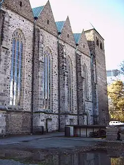 Um das Jahr 1400 wurde die Kirche, vermutlich auf Veranlassung des Erzbischofs Albrecht von Querfurt, zu einer dreischiffigen gotischen Hallenkirche umgebaut. Es entstand aus Sandstein eine fünfseitige Apsis, die man östlich des zunächst bestehenbleibenden Altbaus errichtete. Die Mittelachse der Kirche wurde deutlich nach Süden verlegt. Die Apsis wird wegen ihrer Gestaltung und der durch die fünf hohen, die Wände vollständig einnehmenden Fenster, erzielten Wirkung als die schönste Apsis der Magdeburger Pfarrkirchen angesehen. In den späteren Bauphasen, so beim Langhaus und beim Chor, wurde sparsamer gebaut. Überwiegend kam nun Grauwacke zum Einsatz, nur für Fenster und Verzierungen wurde weiter Sandstein verwandt.