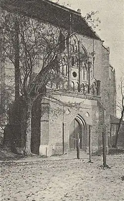 Der ursprüngliche Turm an der Westseite blieb, aus heute nicht bekannten Gründen, auch nach Abschluss der Arbeiten am Kirchenschiff erhalten, obwohl er aufgrund der nach Süden verlagerten Mittelachse nun die Kirche nicht mehr mittig abschloss. 1480 wurden die Umbauarbeiten abgeschlossen. In dieser Zeit entstand vor dem Doppelportal des südlichen Seitenschiffes eine Vorhalle mit gotischem Backsteingiebel.