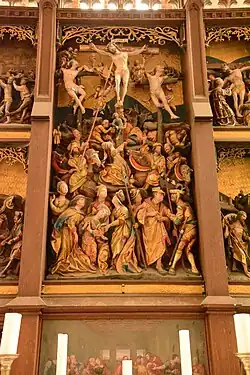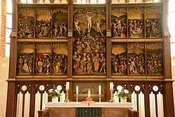 Das Hauptstück der Ausstattung ist ein Schnitzaltar vom Anfang des 16. Jahrhunderts mit stark plastischen Reliefs, der in der Mitte eine große Kreuzigung und seitlich sechs kleinere Passionsszenen zeigt. Die figurenreichen, dramatisch bewegten Darstellungen sind wohl niederländischer Herkunft. Sie wurden 1868 neu gefasst und in einem einheitlichen neugotischen Gehäuse untergebracht. In der Predella wurde eine Kopie des Abendmahl-Gemäldes nach Leonardo da Vinci eingesetzt.