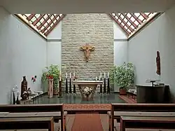 Die geostete, turmlose Kirche verfügt über 68 Sitzplätze. Eine bauliche Besonderheit sind die transparenten Dachziegel über dem Altarraum. Die Rückwand des Altarraumes wird von einem Kruzifix dominiert. Zur Ausstattung der Kirche gehört eine Statue der heiligen Maria. Eine weitere, aus Spanien stammende Statue zeigt den Schutzpatron der Kirche, den heiligen Petrus.