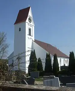 Kirche und Pfarrhaus befinden sich ungefähr in der Ortsmitte neben dem Gemeindezentrum mit Rathaus und Feuerwehrhaus. Das Pfarrhaus ist in drei Kehren über einen Kreuzweg mit Ölberggruppe und Lourdesgrotte mit der etwa fünfzig Meter darüber liegenden Kirche verbunden.