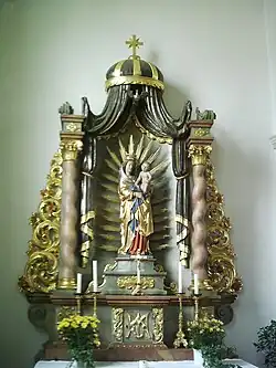 Die Kirche hat einen gotischen biberschwanzgedeckten Westturm mit vier Glocken, zwei Schallöffnungen und einer Uhr mit zwei Zifferblättern. Das Hochaltarbild stammt von Andreas Brugger und zeigt Mariä Aufnahme in den Himmel. Hochaltar und Kanzel stammen aus der Zeit des Barock. Die Kanzel im Langhaus auf der linken Seite ist über einen Aufgang von außen zu erreichen.