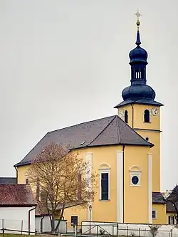 Die Saalkirche wurde 1694–96 erbaut. Sie besteht aus einem Langhaus, einem eingezogenen Chor mit 5/8-Schluss im Osten und einem 33 Meter hohen Chorflankenturm an seiner Nordwand. Die unteren Geschosse sind frühgotisch. Das oberste Geschoss beherbergt die Turmuhr und den Glockenstuhl. Bedeckt ist er mit einer schiefergedeckten Welschen Haube. Die Sakristei wurde in der nordöstlichen Ecke von Chorflankenturm und Chor angebaut. Der Innenraum des Chors ist mit einem Kreuzgewölbe überspannt, der des Langhauses mit einer Flachdecke, die mit Stuck versehen ist. Zur Kirchenausstattung gehören der um 1670 gebaute Hochaltar, der 1812 aus der Jakobskirche Bamberg erworben wurde, und die um 1750 gebaute Kanzel. Eine Vespergruppe entstand um 1520.
