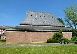 Der Kirchenbau liegt an drei Seiten offen in parkähnlichem Umfeld, an der Schmalseite schließt sie an einen mehrgeschossigen Flügelrest der ehemaligen Klosterbebauung an.[1] Er zeigt sich nach außen verschlossen und nach innen als schützende Hülle. Zwei größere Baukörper sind T-förmig zueinander angeordnet – der eigentliche Kirchenbau mit einem hohen, ziegelgedeckten Fußwalmdach sowie der schmalere und etwas höher gelagerte Schwesternchor, der mit drei kleinen Giebeln gedeckt ist. Beide Baukörper sind nur eingeschossig. Um beide Gebäudeteile läuft in Traufhöhe ein durchgehendes Fensterband, ein zweites belichtet die Kirche weiter oben im Dachbereich.