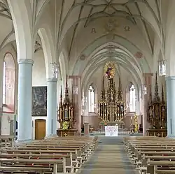 Der Kreuzweg wurde 1884 von Franz Schmalzl aus Gröden geschaffen. Nach der Entfernung in den Jahren 1960–1966 wurden die Reliefs abgelaugt und 1992 von dem Kirchenmaler Ludwig Amann aus Weissenhorn neu gefasst.