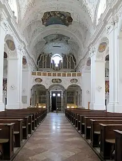 Ab 1678 erfolgte nach den Plänen von Enrico Zuccalli eine Barockisierung der Kirche, bei der auch eine Vierung und ein Querhaus eingefügt wurden. Bis um das Jahr 1694 entstand die reiche Stuckierung und das komplexe Bildprogramm im Gewölbe durch den Maler und Bildhauer Hans Georg Asam.[4] Das 1457 vom Münchner Bildhauer Hans Haldner geschaffene Hochgrab für die Klosterstifter Adalbert und Otkar wurde bei der Barockisierung zwar abgebrochen, die Deckplatte wurde jedoch in neuer Rahmung (datiert mit 1690) als Bekrönung über das Eingangsportal angebracht. Anlässlich der 1000-Jahr-Feier des Klosters im Jahr 1746 wurden an beiden Seitenschiffen Rokoko-Kapellen zu Ehren der Heiligen Quirinus und Benedikt mit Skulpturen von Johann Baptist Straub errichtet.