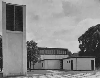 Der Gebäudekomplex verfügte neben der Kirche über kleinere Anbauten, die ebenfalls quadratische Grundrisse hatten. Hierbei handelte es sich um eine Kapelle, die unmittelbar an den Kirchenraum anschloss und zu seinem Betreten durchschritten werden musste. Hier stand auch der Beichtstuhl. Die Kapelle sollte ursprünglich eine Gedenkstätte für die Opfer des Nationalsozialismus sein. Da die Kirche Maria Regina Martyrum bereits als Gedenkkirche existierte, wurde die Kapelle der Mutter Jesu geweiht. Auf der gegenüberliegenden Seite war sie durch einen Windfang mit der Sakristei verbunden. Der Campanile stand direkt an der Straße und war als Tor ausgebildet. Seine Glockenstube war rundum mit hölzernen Lamellen verkleidet.