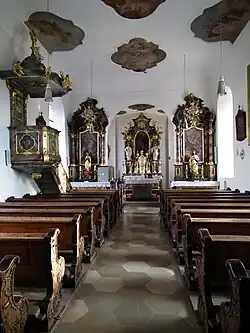 Der Innenraum des Langhauses ist mit einer Flachdecke überspannt. Die Fresken hat 1739 Johann Anwander gestaltet. Der Hochaltar und die Kanzel wurden 1896 vom Münchner Architekten Joseph Elsner senior geschaffen. Die Orgel wurde 1976 als Opus 2315 von der G. F. Steinmeyer & Co. gebaut.[1]
