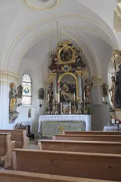 - Der Altar stammt aus dem 17. Jahrhundert. Das Altarblatt, eine Kopie um 1860, stellt die Beweinung Christi dar, im Auszugsbild sieht man die Verkündigung. Links am Altar steht ein Märtyrer mit einem von Pfeilen durchbohrten Herz in der Hand, rechts der heilige Florian, der Schutzpatron bei Brandgefahr. Die kleinen Figuren auf der Altarmensa stellen die Apostel Petrus und Paulus dar.